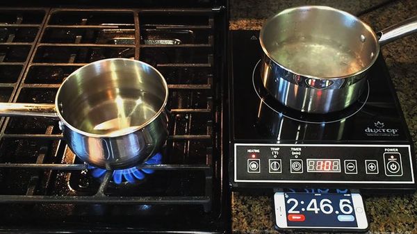 Khi làm thí nghiệm nấu 1 lít nước trên bếp gas thì mất khoảng 4 phút 24 giây để có thể làm sôi và tiêu thụ hết 17 gam gas cho quá trình này. Khi làm thí nghiệm trên bếp từ thì mấy 2 phút 58 giây để làm sôi 1 lít nước và tiêu thụ hết 0.1 KW điện.