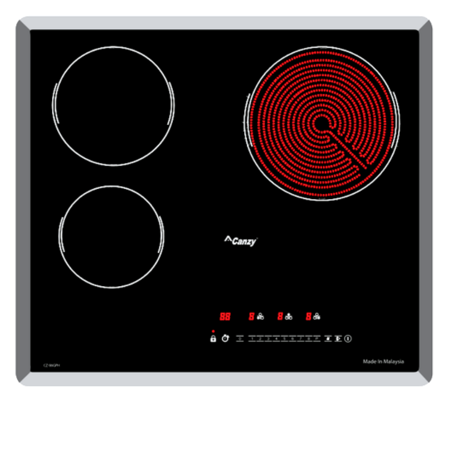 Bếp điện từ 3 vùng cảm ứng CANZY CZ-86GPH Có Mặt kính Vitro Ceramic Sản phẩm này gồm 3 vùng, là sự kết hợp hoàn hảo giữa 2 vùng bếp từ sử dụng các bộ nồi chảo inox từ, tiết kiệm điện và đun nấu nhanh hơn và 1 vùng bếp điện hồng ngoại không kén nồi và có thể nướng trực tiếp trên bề mặt bếp, quá tuyệt vời phải không nào, Chắc chắn sản phẩm sẽ mang đến sự lựa chọn hoàn hảo cho bà nội trợ hiện đại, giúp nấu ăn nhanh hơn và tiết kiệm thời gian.