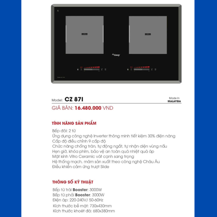 Bếp từ đôi Canzy CZ-87i nhập khẩu Malaysia, sử dụng 2 vùng nấu từ hệ thống điều khiển trượt slide riêng biệt mức gia nhiệt 9 cấp độ, đặc biệt bếp có chức năng nâu nhanh lên đến 3000w giúp chiên sào nấu các món ăn ngon hơn.