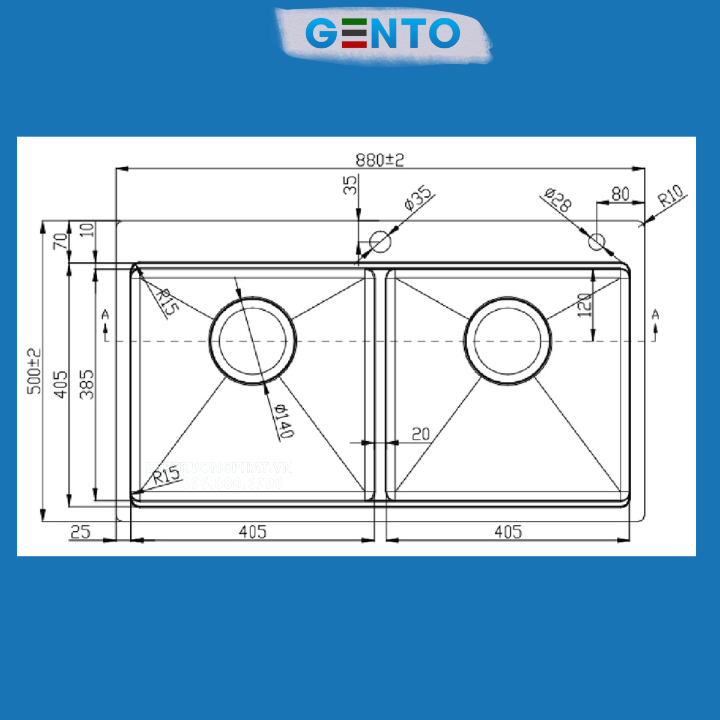 Kích thước hố (mm): R405 x S385 & R405 x S385