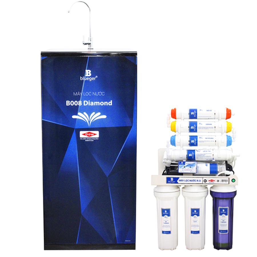 Máy lọc nước Blueger B008 Diamond với 8 cấp lọc giúp loại bỏ các tạp chất, vi khuẩn có hại, nấm mốc và còn cung cấp lại các khoáng chất cần thiết cho cơ thể người dùng. Nguồn nước sạch cho phép bạn uống ngay để giải khát mà không cần phải đun sôi lại. Vỏ tủ VTU làm bằng tôn sơn tĩnh điện và kính cường lực, màu xanh, sang trọng hiện đại.