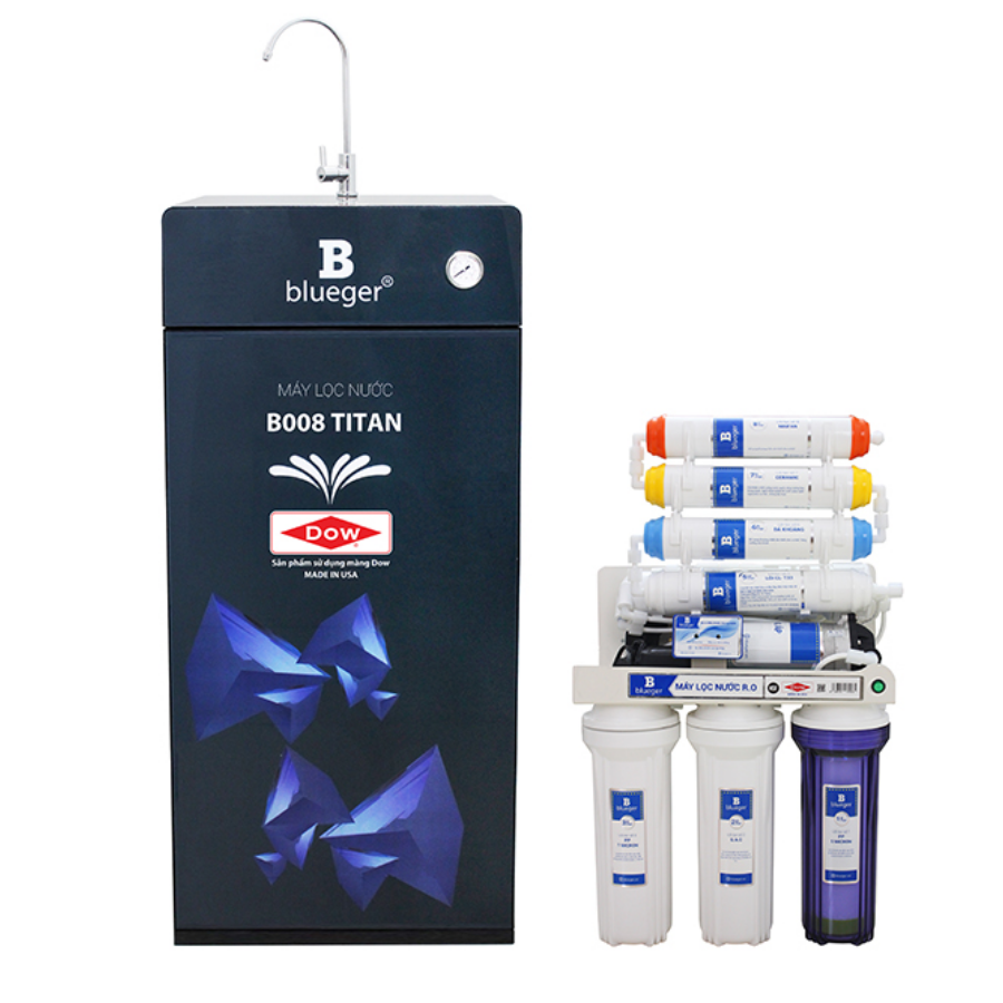 Máy lọc nước Blueger B008 Titan với 8 cấp lọc giúp loại bỏ các tạp chất, vi khuẩn có hại, nấm mốc và còn cung cấp lại các khoáng chất cần thiết cho cơ thể người dùng. Nguồn nước sạch cho phép bạn uống ngay để giải khát mà không cần phải đun sôi lại. Vỏ tủ VTU làm bằng tôn sơn tĩnh điện và kính cường lực, màu xanh trầm, sang trọng hiện đại.